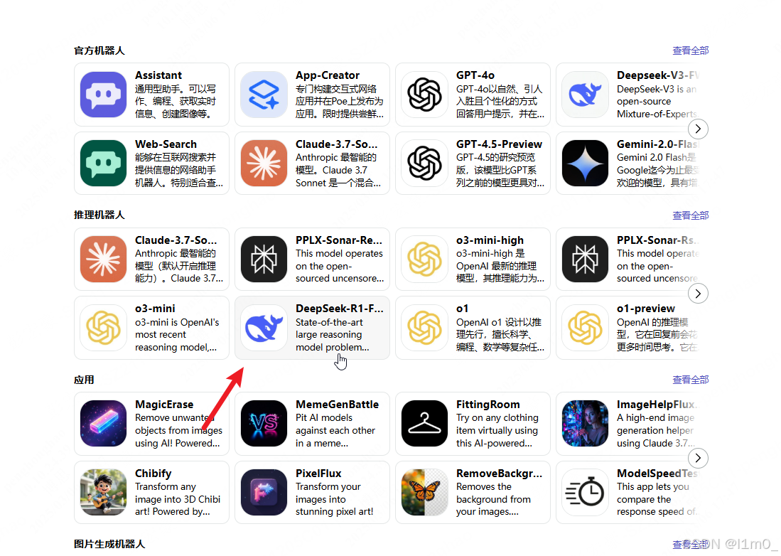 Poe,是国外问答网站Quora推出的AI工具聚合平台。Poe中集成了多个AI机器人,在提问的时候可以切换使用不同的机器人,包括:Sage、GPT-4、Claude+、Claude-instant、GPT-3.5、Dragonfly等,其中也包括DeepSeek V3和DeepSeek R1。点击想使用的AI工具图标,即可进行对话界面,让AI解答我们的各种问题。