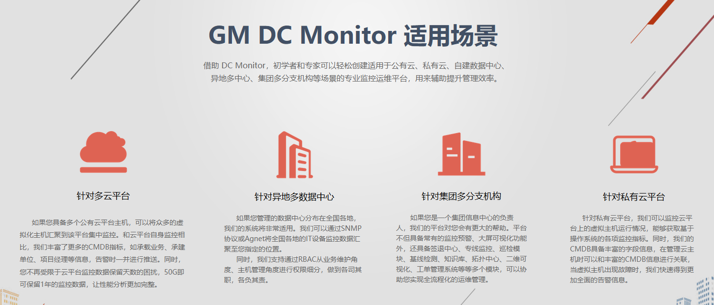 GM DC Monitor v2.0监控预警平台,是把11个实施项目中的“通用功能”拿出来,同时把各个客户具备特色的功能进行了移植,然后本着“简单、易用、好用”的设计思路,整合出来的一体化监控平台。