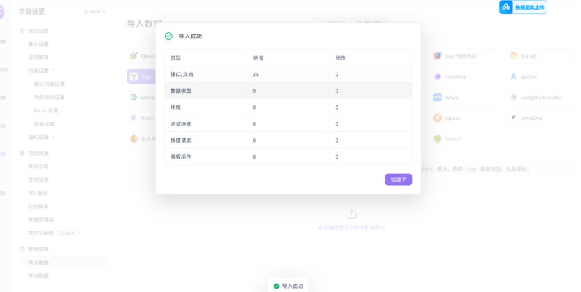通过创建项目后在项目设置->数据管理->导入数据中选择YApi,然后选择需要导入的文件