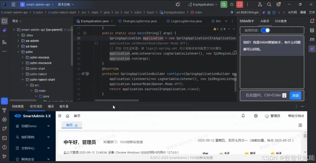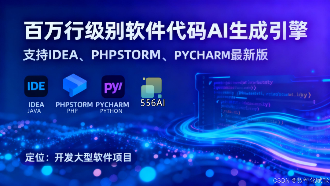 556AI支持IDEA、PHPSTORM、PYCHARM最新版AI平台定位是开发大型软件项目,大型软件项目代码AI生成引擎,OA/ERP/MES 百万行代码一次性AI生成支持axure原型导入预览,集成AI软件设计/AI软件开发/AI软件测试整个流程支持 若依 JEECG SmartAdmin THINKPHP Django等多种JAVA/PHP/python框架实现了java php pytho