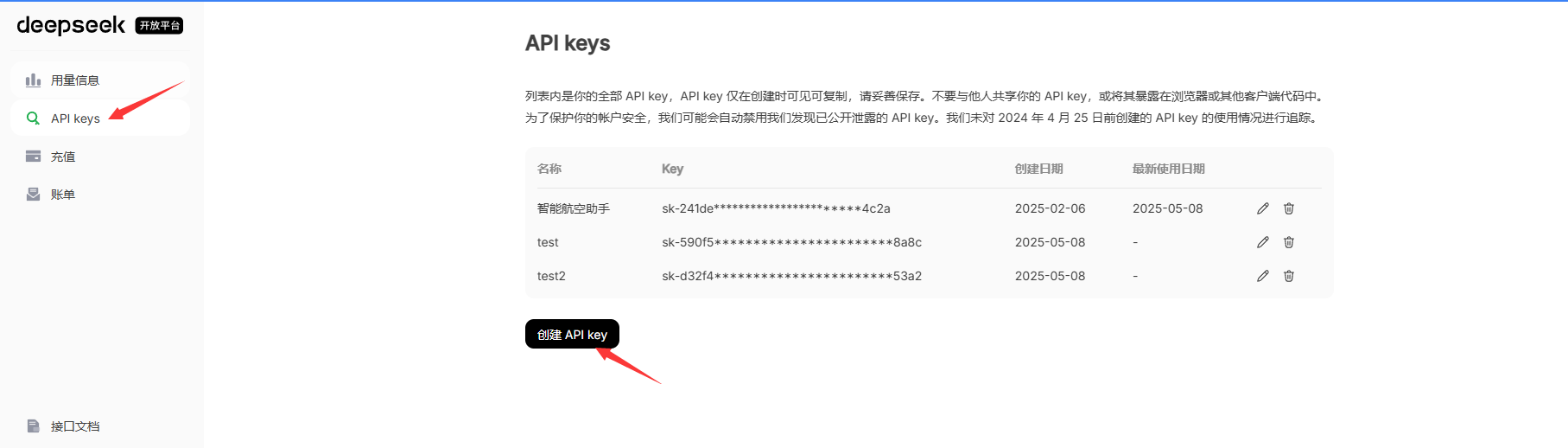 - API Key:需从 DeepSeek 创建并获取 API 密钥:https://platform.deepseek.com/api_keys