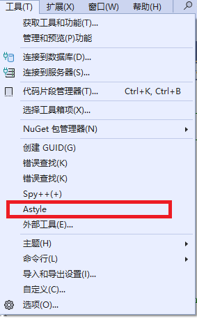 接下来就可以在VS2022中使用了,针对某个文件直接菜单【工具】->【Astyle】 进行美化
