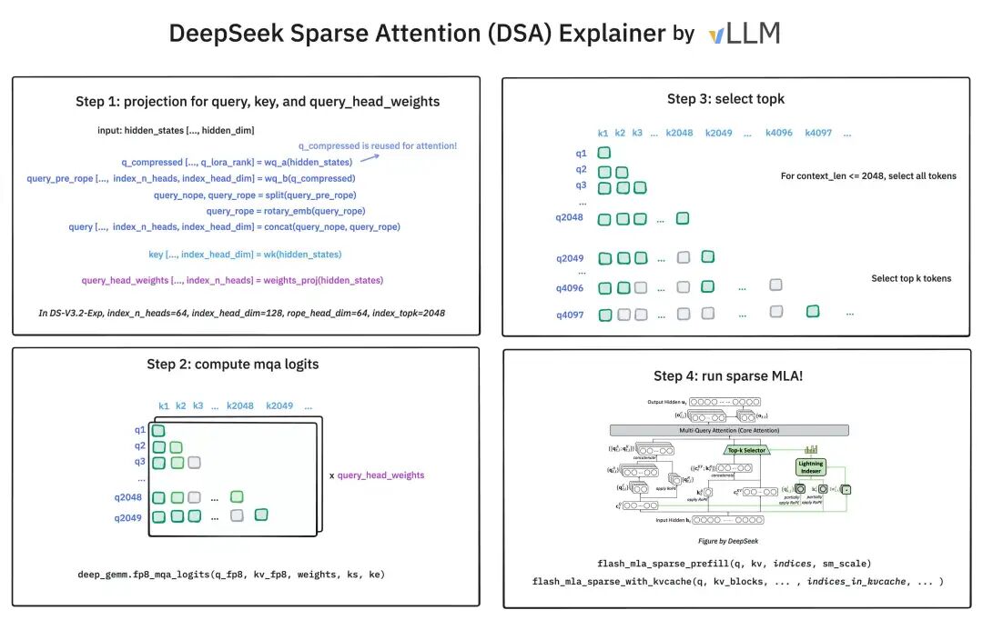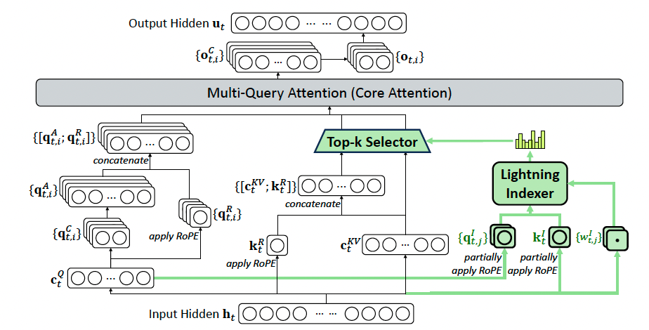 - 绿色路径 (DSA部分): 生成轻量级的和, 进入Indexer, 经过Top-k选择器, 最终输出一个"地址列表", 告诉主注意力应该去关注哪些历史token.