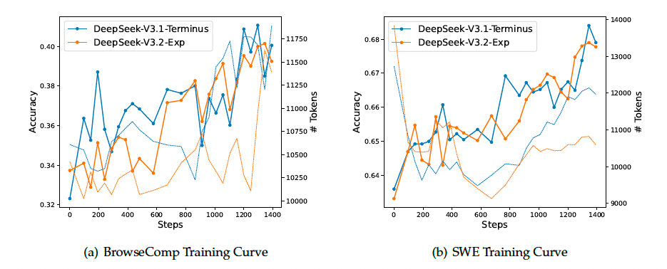 此外, 还比较了DeepSeek-V3.2-Exp和DeepSeek-V3.1-Terminus的强化学习训练曲线, 如图所示. 两模型在BrowseComp和SWE Verified上的性能在整个训练过程中都稳步提升, 且曲线非常贴近, 这反映了DSA的训练稳定性.