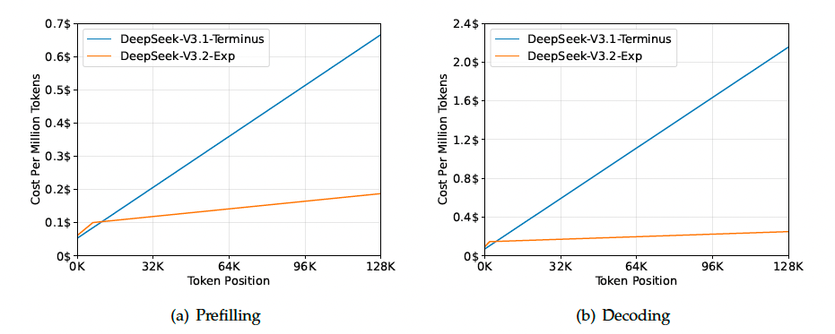 推理成本 (Inference Costs). DSA将主模型的核心注意力复杂度从降低到了, 其中是被选中的token数量. 尽管Indexer仍然具有的复杂度, 但与DeepSeek-V3.1-Terminus中的MLA相比, 它需要的计算量要少得多. 结合优化的实现, DSA在长上下文场景下实现了显著的端到端加速. 图3展示了DeepSeek-V3.1-Terminus和DeepSeek-V3.2-Exp的token成本如何随着token在序列中的位置变化而变化. 这些成本是根据部署在H800 GPU上的实际服务的基准测试估算得出的, GPU租用价格为每小时2美元. 需要注意的是, 对于短序列的预填充(prefilling), 专门实现了一种Mask MHA模式来模拟DSA, 这在短上下文条件下可以实现更高的效率.