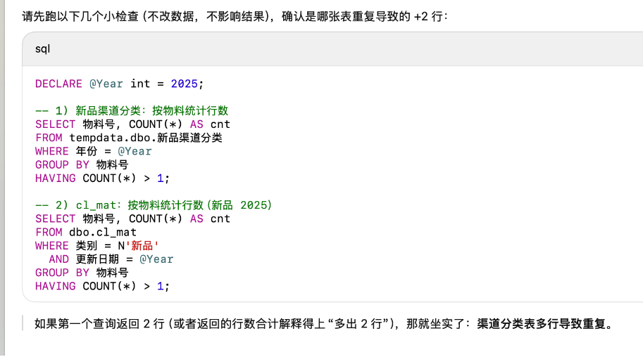 也就是说,给 Claude 时要明确“结果必须与原 SQL 一致”“先给验证脚本”,否则它可能优先交付速度。