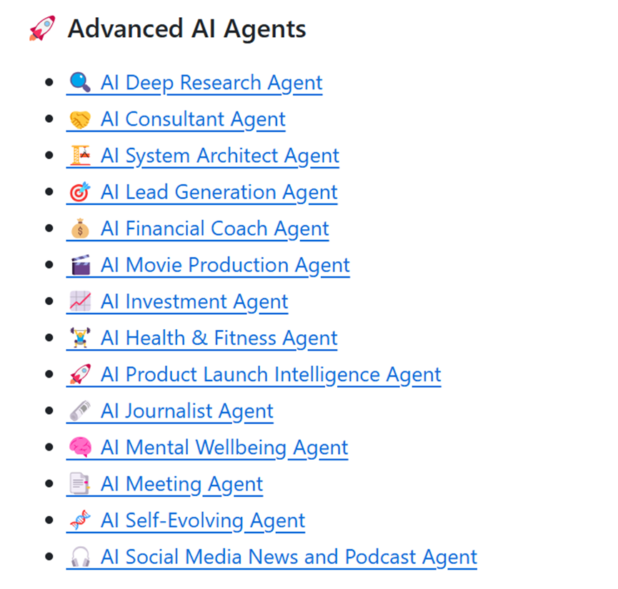 所以,「AIGC开放社区」就为大家介绍一个精选的开源大合集,包括入门级AI Agent、高级Agent、多层级智能体、语音智能体、多类型RAG等非常好用的项目。不仅适合新手,开发老鸟也可以学习借鉴下启发灵感。