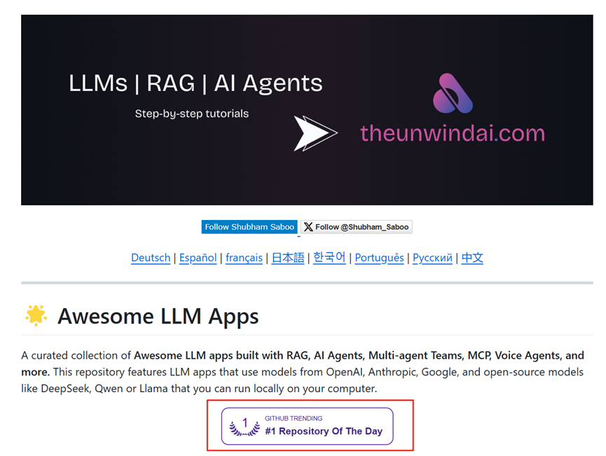 开源地址:https://github.com/Shubhamsaboo/awesome-llm-apps/?tab=readme-ov-file