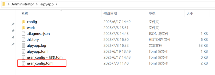 打开 AiPy 的配置文件夹(默认位置:C:\Users\Administrator\.aipyapp),找到【user_config.toml】文件。
