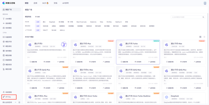 登录阿里云平台,进入通义万相的相关服务页面,申请一个Key。