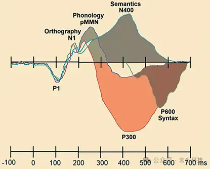 ERPs是研究阅读机制的一种非常有用的工具,因为它们能够提供从刺激开始到大脑内发生过程的多个指标,精确到毫秒级。这些过程包括从感官视觉特征分析(例如,曲线或直线、角度、圆等),到正字法分析(字母识别),再到复杂模式分析(单词),以及这些模式的正字法特征(例如,德语、英语或芬兰语中有很大的差异)和意义分析。