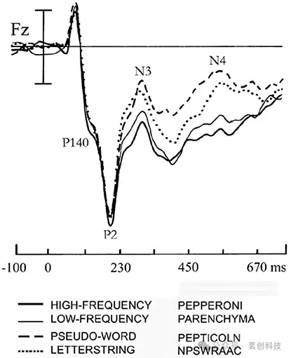 图3.在音位决策任务(例如,在oranges中是否出现了音素/k/?)中记录了对单词、伪单词和字母串的ERP波形。第一个词汇效应出现在P2水平。