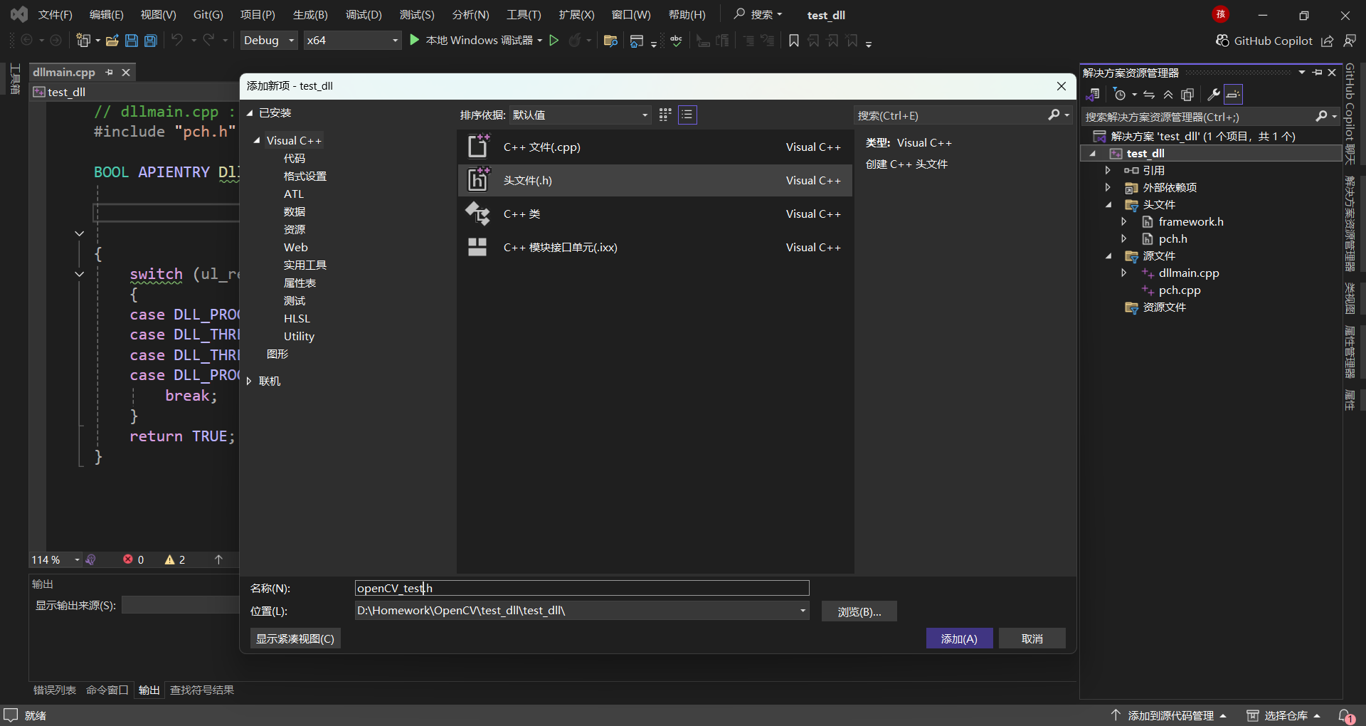 创建好了之后,在解决方案资源管理器中,右键项目,选择添加(D) -> 新建项(W)->选择头文件(.h),然后随便取一个名字,我这取的是openCV_test.h