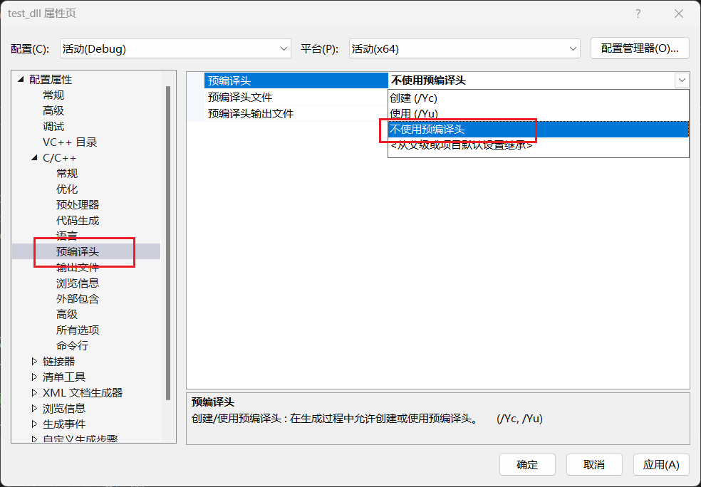 在开始编译之前,我们还需要进行一些操作,打开解决方案资源管理器,右键项目名称 -> 属性 -> C/C++ -> 预编译头,将预编译头更改为不使用预编译头,点击应用 -> 确定。