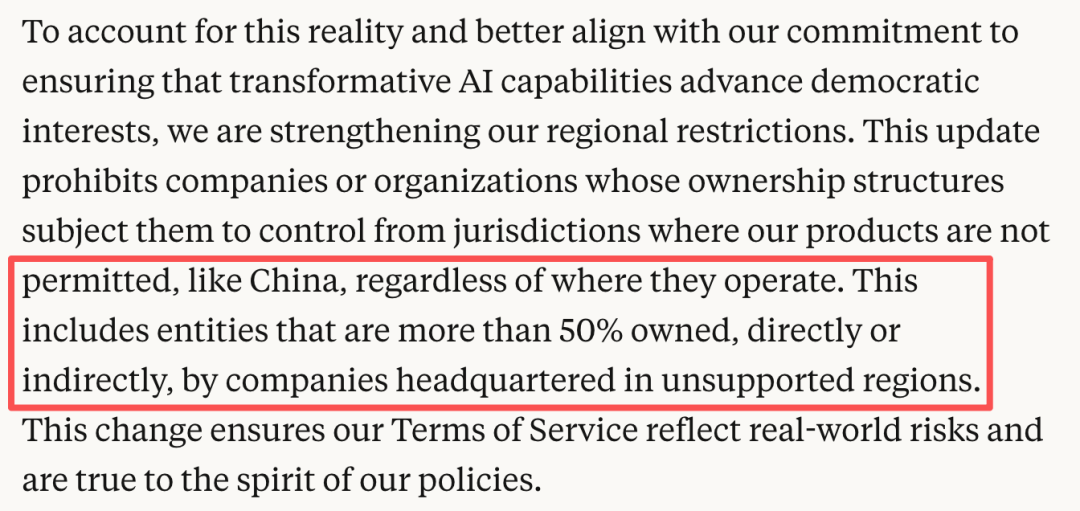这次直接从源头掐断了所有中资背景企业接入 Claude 的可能,咱们平时学习用的 Claude,写代码、调模型用的 Claude Code,也一刀切让中资控制企业没得用了。
