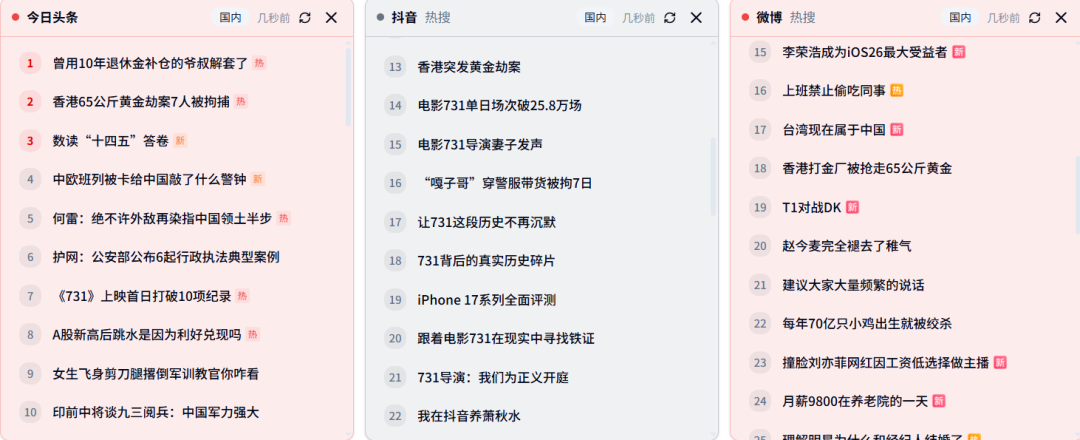 聚合九大平台的热点榜单,在这里你可以找到各个平台的热榜。