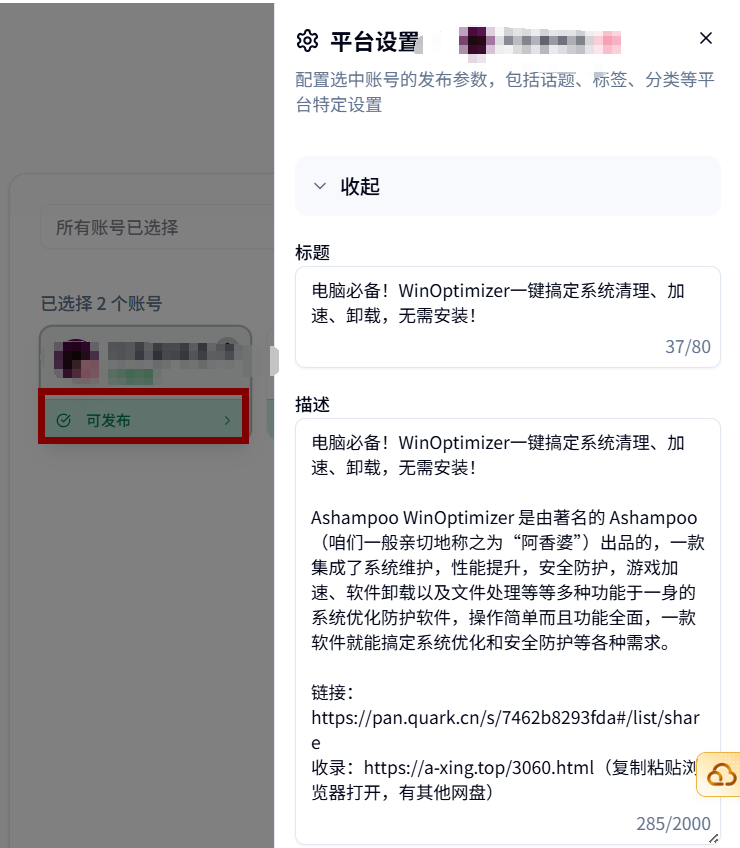 群友推荐,我自己也测试了一段时间,没有广告,支持抖音、快手、视频号、小红书、B站、微博、知乎、百家号和头条号等共计九大平台。