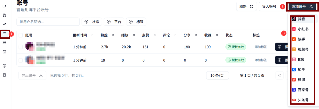 支持抖音、快手、视频号、小红书、B站、微博、知乎、百家号和头条号等共计九大平台。