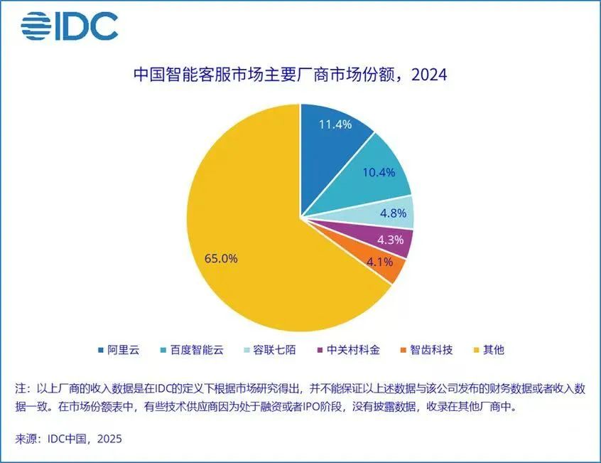2024年至今,随着DeepSeek的异军突起,国内大模型厂商开启的“价格战”显著降低了模型推理成本,加速了智能客服行业用户应用大模型的进程。IDC最新发布的《中国智能客服市场份额,2024:持续变革,落地加速》,聚焦在为用户提供“软件+服务”的AI赋能的智能客服解决方案市场。报告显示,2024年前五大主要厂商市场份额达到了35%,集中在阿里云为代表的云服务企业,以中关村科金为代表的AI创新企业和以容联七陌为代表的传统客服企业。