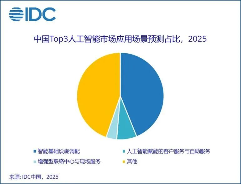 IDC《全球人工智能和生成式人工智能支出指南》预计,到2028年中国人工智能总投资规模将突破1,000亿美元,其中生成式AI投资规模超300亿美元。其中,2025年中国市场Top3 的人工智能应用场景分别是智能基础设施调配、人工智能赋能的客户服务与自助服务、增强型联络中心与现场服务,后两者都是新一代智能客服的范畴,也是当前AI大模型应用落地最广泛、最成熟的场景。