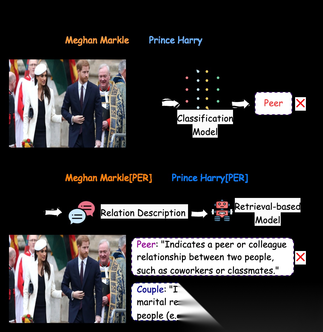 - 现实数据常伴随视觉信息,这使得现实场景中的关系判别往往需要综合图文线索协同推理。