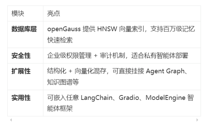 经过多轮对比,我选择了 openGauss —— 华为主导开源的企业级数据库。它在最新版本中集成了 DataVec 向量引擎,可直接支持向量存储与检索,非常适合做 Agent Memory 存