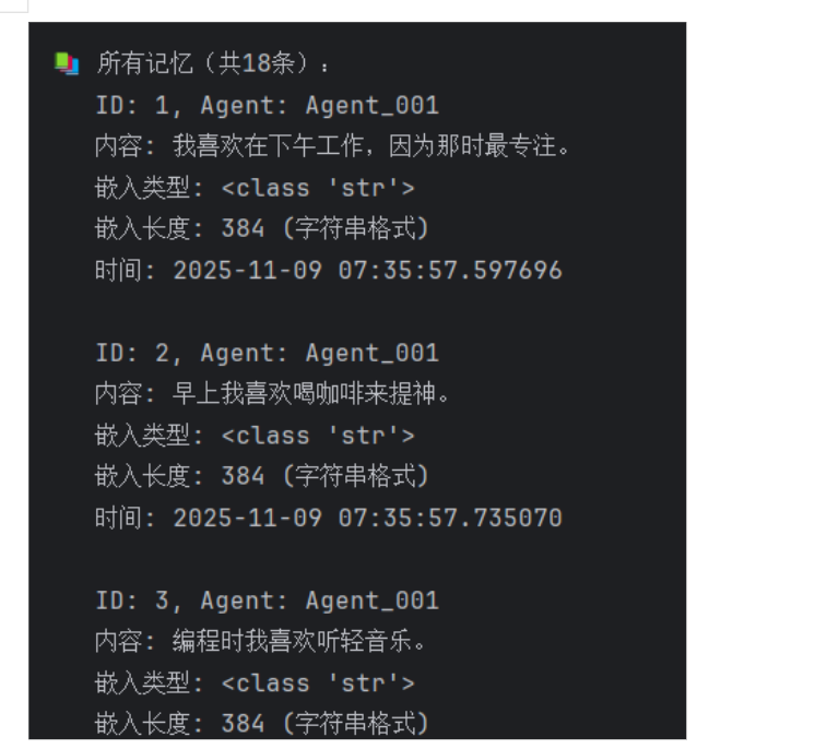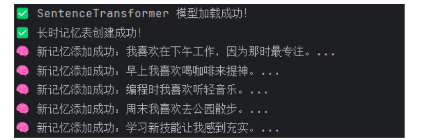 这个长时记忆系统的效果相当出色!系统成功实现了基于语义的智能记忆检索,能够准确理解用户查询的深层含义并找到最相关的记忆内容。对于"学习"的查询,系统精准地匹配到了"学习新技能让我感到充实"这条记忆,相似度高达0.66,展现了优秀的语义理解能力;在搜索"工作习惯"时,系统不仅找到了"编程时我喜欢听轻音乐",还识别出了"工作时需要安静的环境"这一相关记忆,体现了多维度联想的能力。整个系统从向量编码、存储到相似度计算都运行流畅,检索结果合理且具有很好的实用性,证明了这个基于SentenceTransformer和余弦相似度的长时记忆方案在实际应用中确实有效,为构建更智能的对话系统奠定了坚实基础!