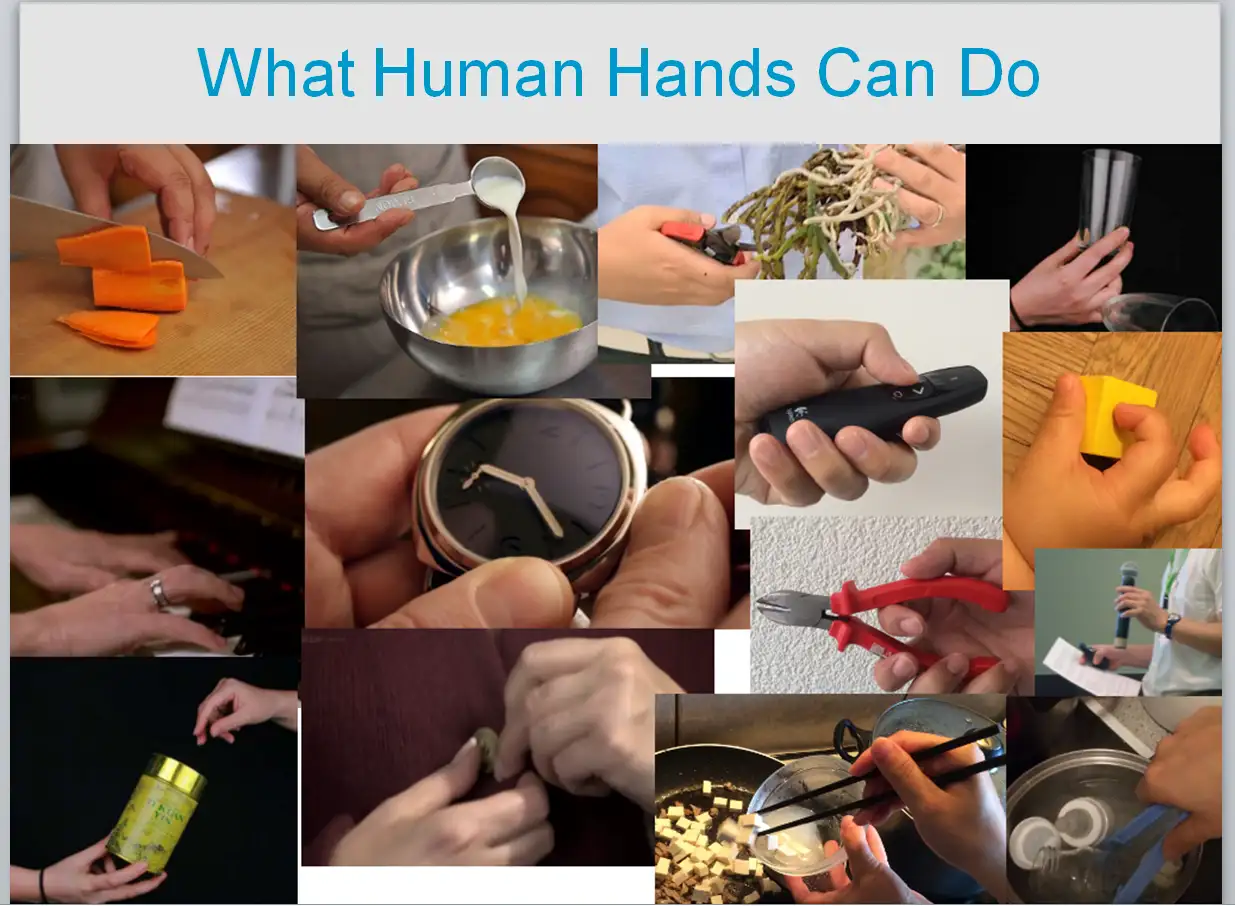 复杂的原因就不扯了,感受下人手能够做的事情,见下图。这里面的动作都是很日常的人手的活动,但是目前机器手还远远不会。