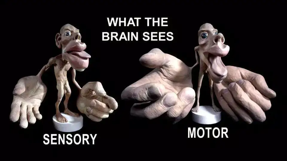 在大脑看来,人的身体是这样的(见下图)。看见没有, 手是被放大了很多很多倍的,也就是说大脑其实消耗了很多能量在监控和控制着你的手,而在你看来,这一切仿佛就是自然发生的,完全没有什么控制。