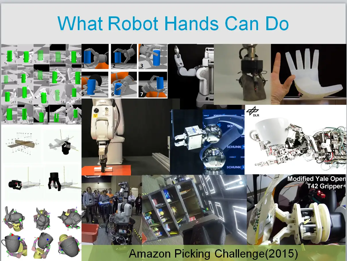 robot hand还大多数停留在仿真里面,在现实世界就开始用gripper(夹具)了,或者是吸盘来吸,看下2015年Amazon Picking Challenge 的前三名所用的手吧(吸盘,gripper, gripper), 完全没有机器人手什么事情。