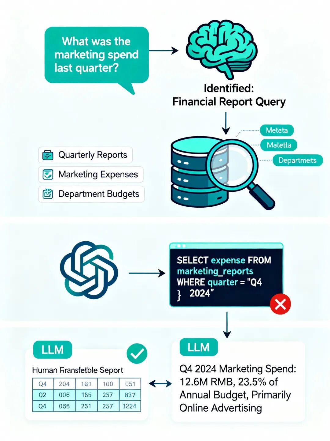 第二个模块根据意图结果,在知识库或数据库中识别相关数据源。它会在内部元数据中查找"季度报表"、“营销支出”、"部门预算"等表格或文档位置。
