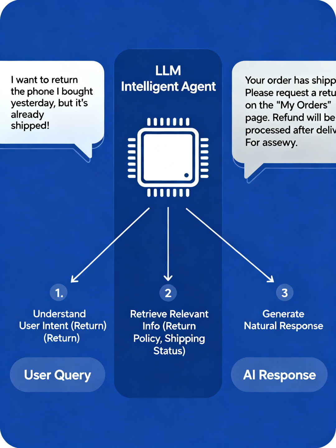 而基于普通 LLM 智能体的客服系统能显著改善这一问题。假设 LLM 被训练或微调在企业的业务知识库之上(包括产品手册、订单流程、退换货政策、常见问题等),用户便可以用自然语言提问,例如: