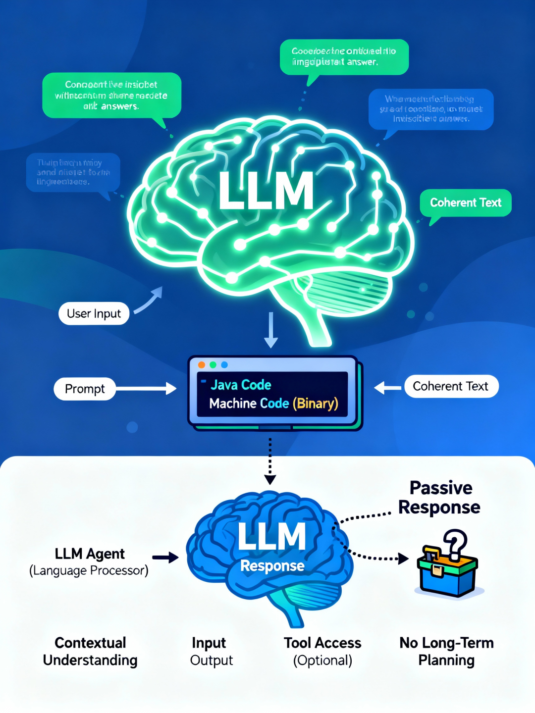 通俗来讲,我们可以把普通的 LLM 智能体看作是一个极其复杂的语言处理器,这个和我们电脑系统的编译器类似,把我们编写的 Java 语言转换为机器可以理解的机器语言(二进制代码)。