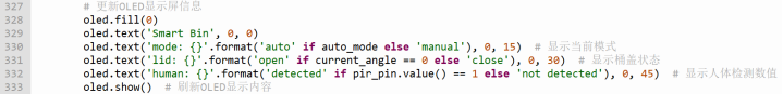 数据显示模块:利用OLED液晶屏实时展示包括当前模式、桶盖状态以及人体检测数据等信息,使用户可以方便地进行本地查看,及时获取垃圾桶的工作状态。