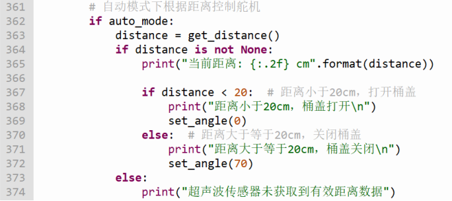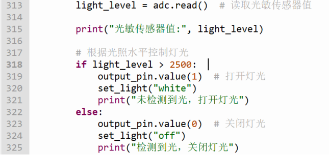 在智能垃圾桶的设计中,RGB灯的控制是提升用户体验的重要组成部分。以下代码段定义了一个名为 set_light 的函数,用于根据用户指定的颜色设置RGB灯的状态。该函数通过控制GPIO引脚,实现了对红色、绿色和蓝色灯的独立控制,从而可以显示出多种颜色,包括红、绿、蓝和白色。