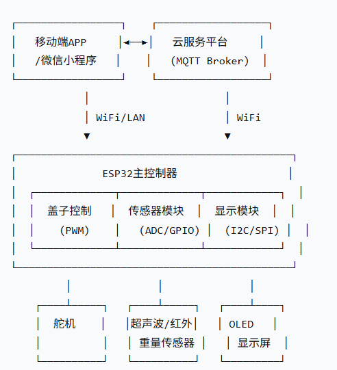 本系统的硬件架构以ESP32作为控制核心,包含盖子控制机构、传感器模块、显示模块和通信模块。系统支持本地自动控制和远程云端监控两种模式。