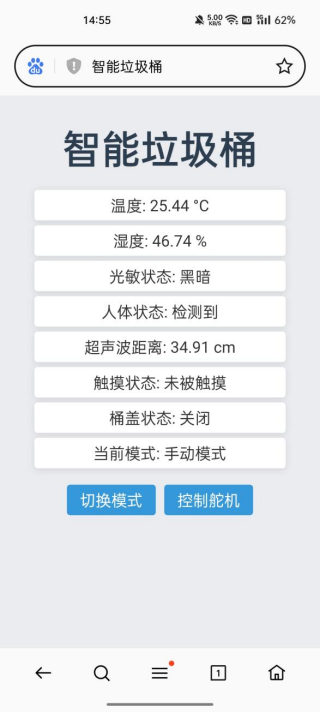 5. 网页端设计 - 网页端与 ESP32 服务器之间的数据交互采用异步通信方式(如 AJAX 或 Fetch API),避免页面刷新对用户操作造成干扰。此外,为了提高系统的安全性,网页端与服务器之间的数据传输进行了加密处理,防止数据泄露和恶意攻击。在页面加载时,通过 JavaScript 代码初始化与服务器的连接,并获取初始的系统状态数据进行显示。系统状态发生变化时,服务器会主动推送消息至网页端,确保用户能够实时监控智能垃圾桶的操作和状态。网页设计如图