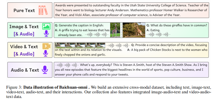 为提升多模态协同理解能力,构建了 “图像 - 音频 - 文本”“视频 - 音频 - 文本” 混合数据集:
