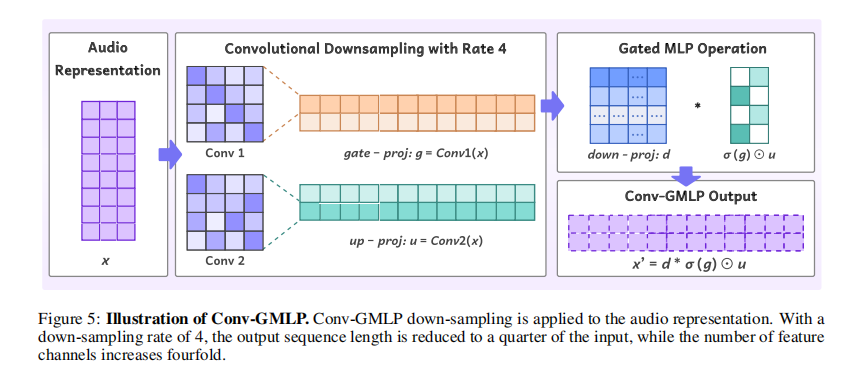 - 音频投影器(核心创新):用 Conv-GMLP 替代传统池化,解决高倍下采样导致的信息丢失问题: