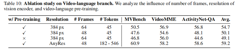 - 视频预训练:关键(无预训练时 MVBench 落后 6%)。