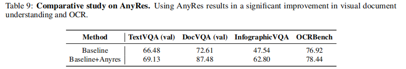 - 结论:AnyRes 技术显著提升依赖图像细节的任务(如 DocVQA 提升 14.87 个点),支持任意分辨率输入的同时保留细节信息。