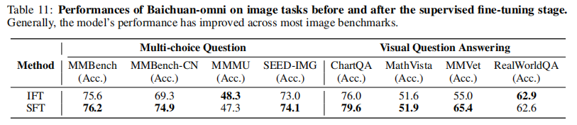 - 图像任务(表 11):SFT 后 MMBench-CN(74.9 vs 69.3)、MMVet(65.4 vs 55.0)等均显著提升;