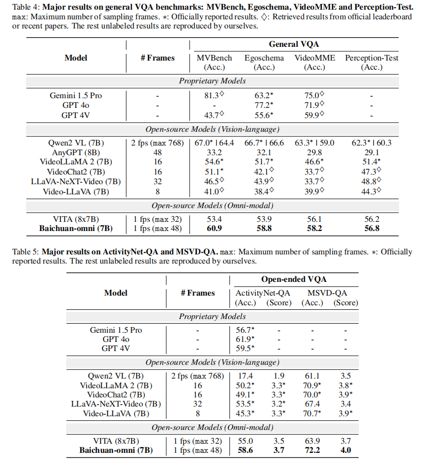 论文在语言、图像、视频、音频四大模态的主流基准上进行了零样本评估,对比了闭源模型(GPT-4o、Gemini 1.5 Pro)与开源模型(VITA、Qwen2-VL 等),结果显示 Baichuan-Omni 在开源模型中表现突出,部分任务超越闭源模型。