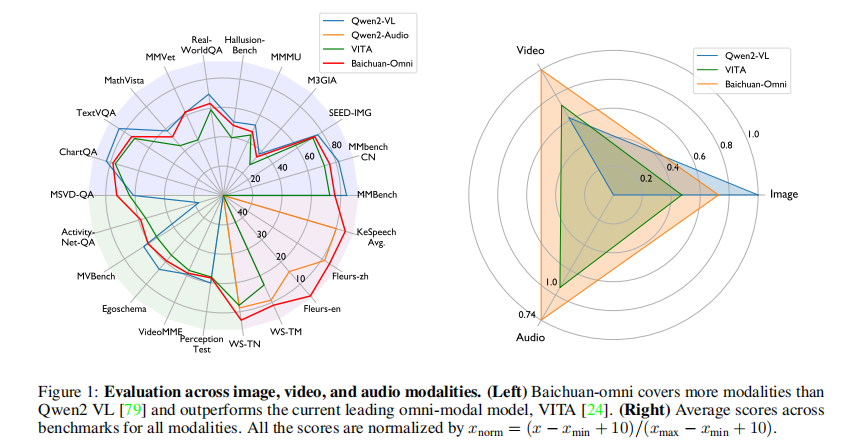 - 右图:Baichuan-Omni 的多模态平均分数(0.74)显著高于 VITA,体现全模态均衡性与领先性。