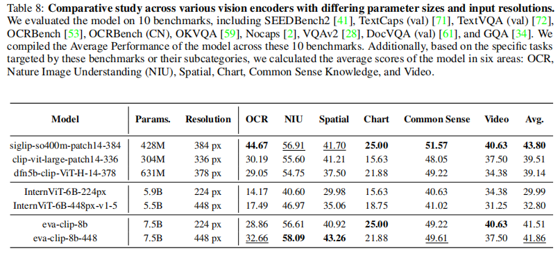 - 最优选择:Siglip-so400m-patch14-384(428M 参数)在 OCR、自然图像理解等 6 项任务中 4 项最优,平均分数 43.80,兼顾性能与效率。