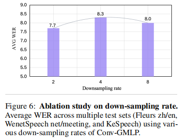 测试不同下采样率(2、4、8)对 ASR 平均 WER 的影响(图 6):