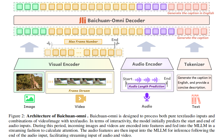 Baichuan-Omni 的架构设计围绕 “多模态统一编码 + 流式交互” 展开,如图 2 所示: