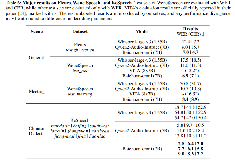 - ASR 性能:中文场景大幅领先(Fleurs-zh WER 7.0% < Qwen2-Audio-Instruct 9.0%),方言识别(KeSpeech 平均 CER 6.7%)表现优异,会议场景(WenetSpeech test_meeting CER 8.9%)超越 VITA(16.5%);