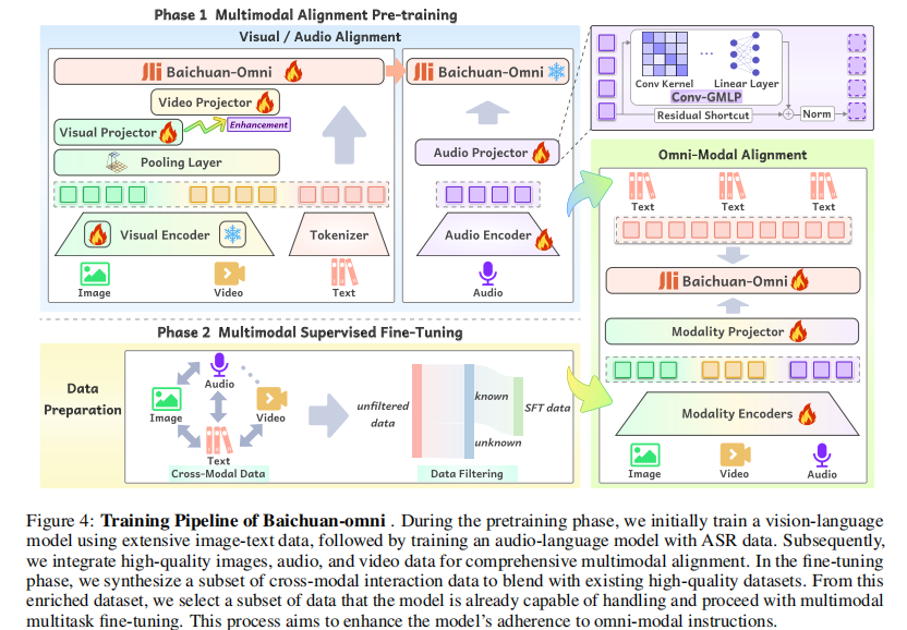 Baichuan-Omni 的训练分为三大核心阶段:高质量全模态数据构建→多模态对齐预训练→多任务微调(SFT),形成端到端的技术闭环。