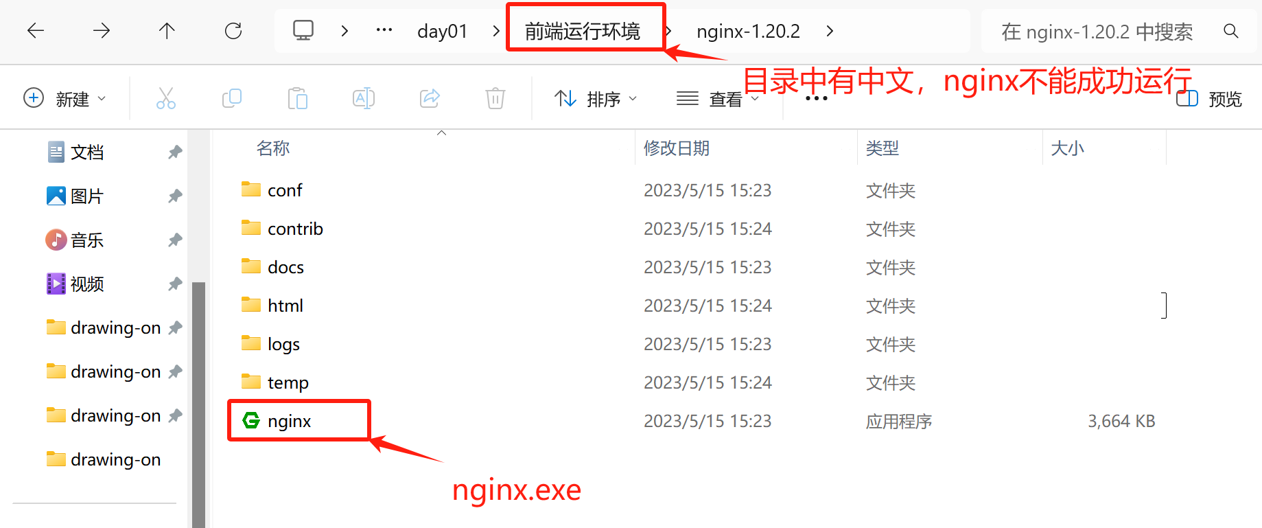 若要成功启动nginx.exe,则需将nginx-1.20.2文件夹放在无中文的目录下